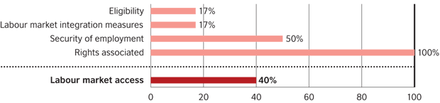There is a wide variation between the four dimensions of this strand. The rights associated with employment achieve a best practice score of 100%: Migrants who find work can join trade unions and work-related political parties or to change employers, jobs or professions after less than one year of legal employment. However, in order to first find work, migrants in Hungary face both unfavourable eligibility provisions and labour market integration measures. The same is also only in LV and PL. They cannot, for instance, get jobs or start businesses in the same way as EU-nationals. There are restrictions on their access to education and training, whilst no other national integration measures exist